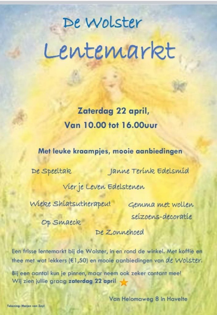 Nieuws & Activiteiten Vier de Lente Het is weer volop Lente! En daarom organiseert De Wolster zaterdag 22 april 2023 De Wolster Lentemarkt. Je bent van harte welkom aan de Van Helomaweg 8 in Havelte van 10.00 -16.00 uur om het voorjaar te vieren. Je kunt hier lekker neuzen tussen de kleurrijke fijne kleding van […]